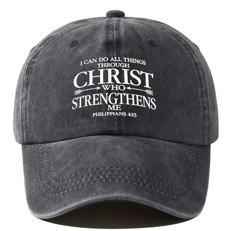 This inspirational Christian baseball cap features the empowering Philippians 4:13 verse, “I Can Do All Things Through Christ.” Made from lightweight, slightly stretchable 100% polyester, this adjustable unisex dad hat offers comfort for men and women during church, sports, or outdoor activities. Available in several colors, it is machine washable for easy care and makes a meaningful faith-based gift. Crafted with care in Beijing, it combines style and spiritual strength in one versatile accessory.