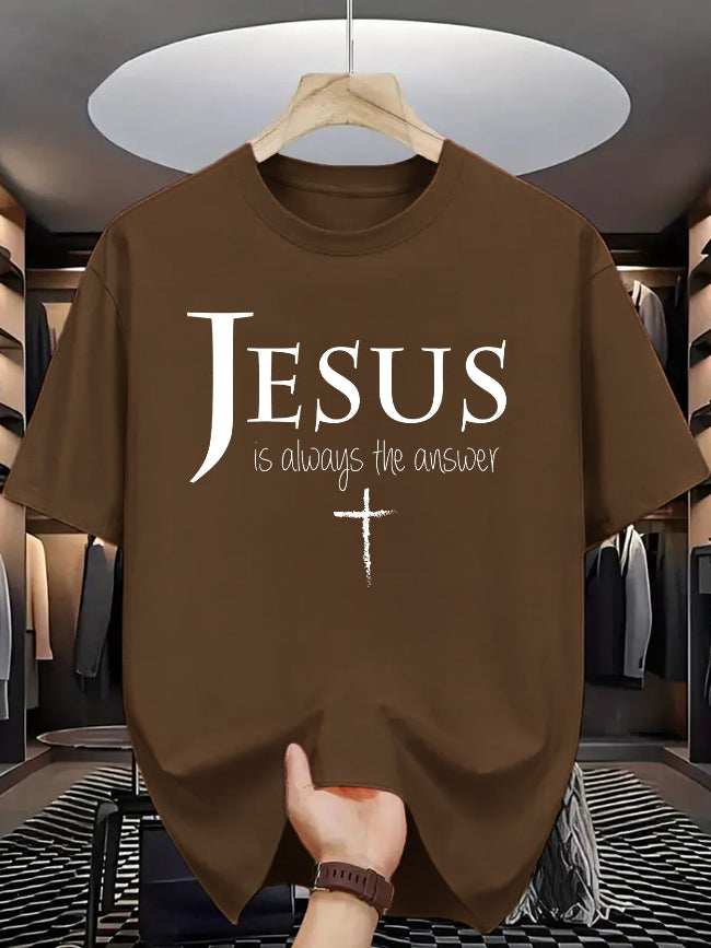 This men's short sleeve tee offers a comfortable fit for everyday wear with its soft 100% polyester fabric. Featuring the inspiring message "Jesus is Always the Answer," it serves as a meaningful reminder of faith. Designed with a classic crew neck and available in many colors with black or white print. This lightweight shirt is perfect for any season. Easy to care for with machine washable durability, it blends casual style with spiritual encouragement for your daily journey.